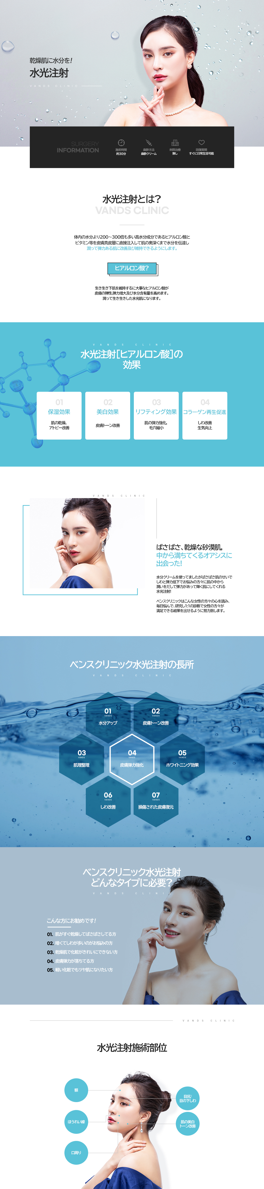 乾燥してパサついたお肌に ヒアルロン酸を注射で真皮層に直接注入することで 水分不足の肌にうるおいを与え、みずみずしくハリのあるお肌が期待できます。